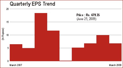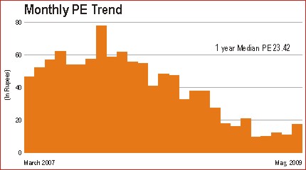 Still, in the first quarter of CY09, operating margins of the company improved considerably to 14.7 per cent compared to 0.7 per cent in the previous year’s corresponding quarter. The profits also went up considerably to Rs 225 crore in the current quarter. Being a zero-debt company, it is trading at a premium of 17 times its trailing four quarter earnings, but this is still lower than its historic range of 20-23 times.