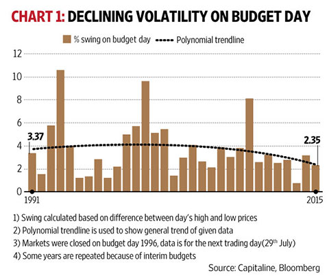 The market moved more than 10% (the difference between the day's high and low for the Sensex) when the government presented the budget in 1993. This was down to 2.35% in 2015. The average budget day move has decreased from 4.2% in the 90s to 3.78% in the subsequent decade, and 2.49% after 2010.