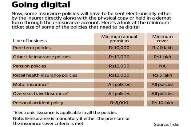 For policies of certain ticket size, e-insurance is mandatory (see table). However, all motor and overseas travel insurance policies need to be issued electronically.