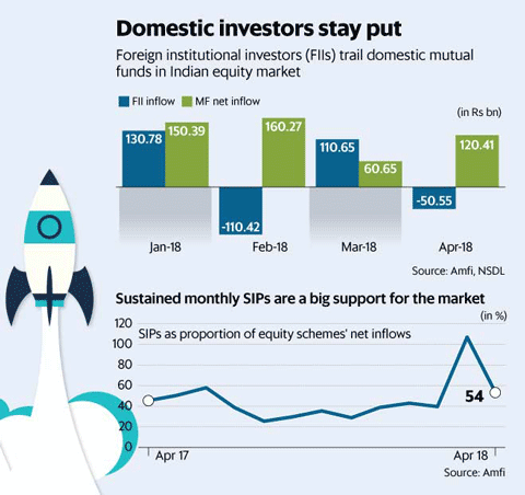Mutual fund investors have shown resilience and faith in domestic equity markets at a time when foreign investors seem to be looking elsewhere. Since January to April-end 2018, net inflows in domestic equity mutual funds are slightly over Rs 50,000 crore compared to nearly Rs 29,000 crore for the same period last year. This comes on the back of regular systematic investment plan (SIP) inflows increasing to Rs 7,119 crore in March 2018 as compared to a monthly inflow of Rs 4,335 crore in March 2017.
