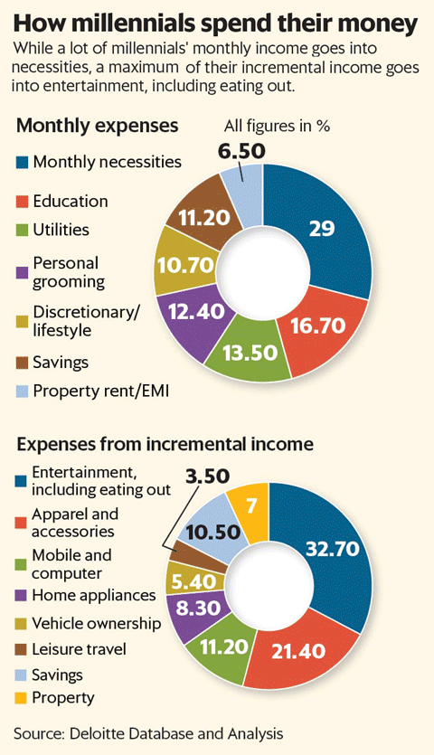 A February 2018 Deloitte report on Trend-setting Millennials shows that millennials in general spend more on discretionary items as their disposable income rises. Also, 32.7% expenses from incremental income is spent on entertainment, including eating out and 21.4% on apparel and accessories. Savings, in most cases, is under 10% of overall income, shows the report.