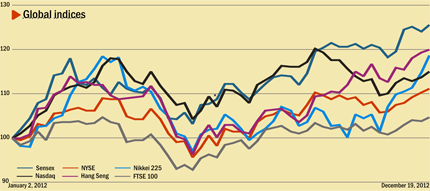 The Sensex posted 25.5 per cent return in 2012, the highest among all major global indices, while Hang Seng stood second by giving away a return of close to 20 per cent. Reflecting the tough economic climate that the European markets endured, London's FTSE 100 rose by just 4.5 per cent in 2012.