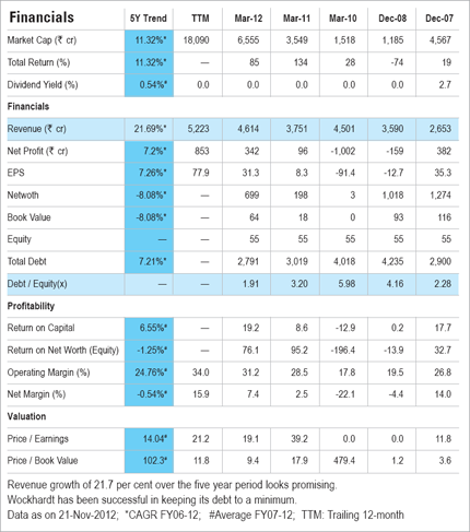 Wockhardt has had to pay a tough price to get back into shape. It had to let go of its nutrition business and well-known brands of Farex, Protinex, Dexolac and Nusobee to France's Danone for a consideration of Rs 1,280 crore, in July 2012. The company expects to come out of CDR before the end of the current financial. The current net debt stand at Rs 1,230 crore, with the current debt-equity ratio of less than 1 only expected to fall further as the company further pares down debt.