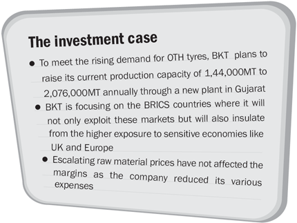 Global demand for OTH tyres is rising in the replacement market of developed countries such as the US. BKT plans to raise its current production capacity of 1,44,000MT to 2,076,000MT annually by commissioning a new plant at Bhuj in Gujarat ( capex of Rs 531 crore). It is expected to achieve full utilisation by 2015.