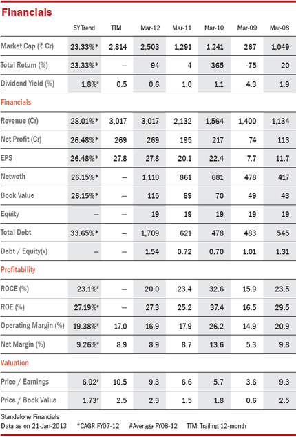 * Free cash flow has been negative in the past 5 years except FY10. Negative cash flow in FY12 stood at Rs 532 crore and is expected to be at the same level in FY13 due to the high capital expenditure. The situation will improve only when the new plant at Bhuj starts operating near 90 per cent of the capacity