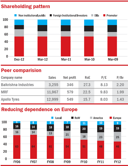 * By operating mainly in the replacement market, BKT has an edge over OEMs since the margins are higher in replacement market. It already has one of the highest profit margins among the domestic tyre manufacturers: 10.6 per cent, whereas MRF is a distant second with a net margin of 4.4 per cent