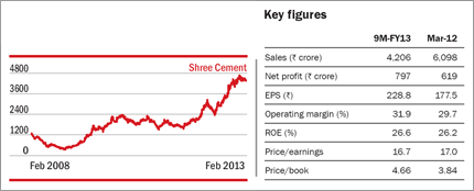 This mid-sized cement manufacturer also sells merchant power. For the half-year ending December 2012 quarter (Shree's year-ending is in June), two primary factors helped the company leapfrog FY12 performance. The first is the scaling up of its power business – up 120 per cent (y-o-y) and the second is the steady growth of its cement business – up 20 per cent (y-o-y).