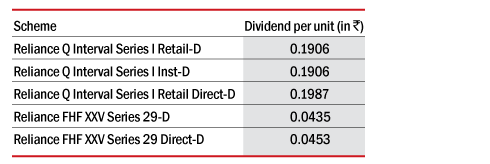 The fund house also announced dividend under the dividend option of Reliance FHF XXIII Series 6 Direct-D and Reliance Dual Advantage FTF I Plan I-D.