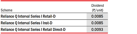 The Fund House also announced dividend under the dividend option of Reliance Q Interval Series I Retail-D, Reliance Q Interval Series I Retail Direct-D and Reliance Q Interval Series I Inst-D.