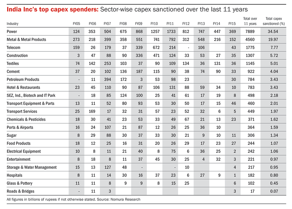 The third biggest capex spender is the telecom industry, with 7.7 per cent of all capex sanctioned in the last 11 years coming from this sector. Rapid expansion in network, especially for the data services rolled out over the last couple of years, including the roll-out of 4G, even before the entire country was 3G enabled, has kept telecom companies on their feet. The top three telecom companies, Airtel, Vodafone and Idea, for instance, have announced plans to invest over ₹30,000 crore this financial year to roll out 4G and strengthen their existing 3G networks. The new entrant Reliance Jio is reported to have invested ₹1 lakh crore towards tower installations and network expansions alone.