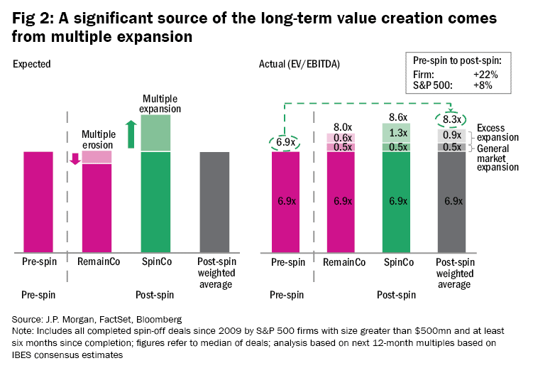 The report goes on to observe (see Figure 2): "One would expect that the separation of a high-growth subsidiary would lead to a decline in the valuation multiple of the RemainCo relative to the parent company. This intuition does not, however, play out in practice. We find that the valuation multiples of both RemainCo and SpinCo increase relative to the pre-spin company. We estimate the uptick in valuation multiples post-separation to be over 20 per cent. Admittedly, broader-market multiples also increased during that period, but after controlling for this general uplift in multiples, we still find the difference to be material, remaining in the 10%-20% range."