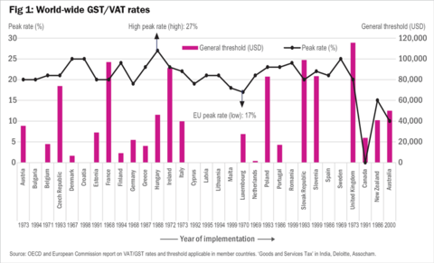 Also, a bulk of the goods and services will be taxed at 18 per cent, 28 per cent and 28 per cent with surcharge. As far as peak rates go, India's peak GST rates are one of the highest in the world, among countries which follow a GST/VAT form of indirect taxation. (See Figure 1). The question is why this is the case. The rates of taxes under GST on various goods and services were decided by the GST council. Their mandate was to fit the GST rate on goods and services close to the existing taxes. And that's precisely what they did.