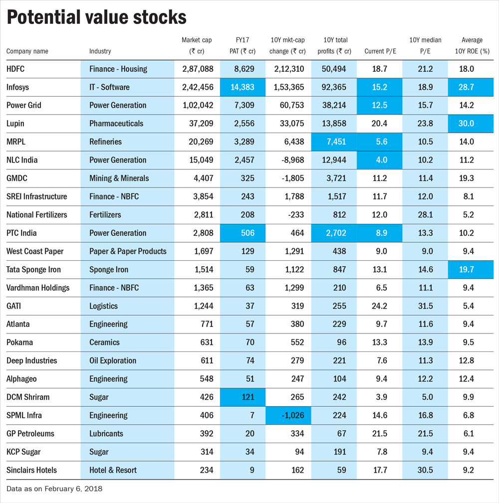 There's Infosys with its rocky past couple of years. Infosys earned cumulative profits of over Rs 92,000 crore in the last 10 years, while its market value has increased about 1.6 times during this period. Also, it trades at PE of 15x, much lower than its 10 year median of close to 19 times earnings.