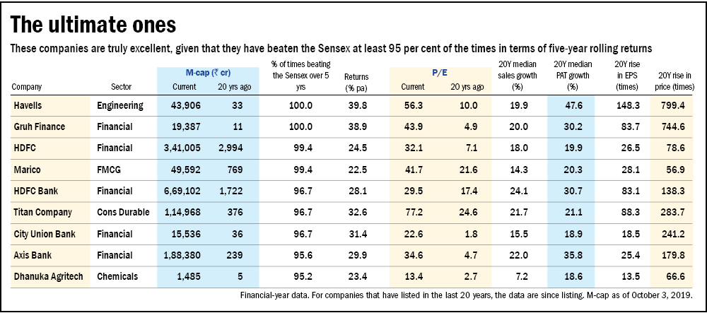 This ultimate set of companies managed to beat the five-year Sensex rolling returns more than 95 per cent of the times (see the table 'The ultimate ones'). More clearly, if you invested in any of these stocks in any given month over the last 20 years, even at their highest monthly trading prices, and thereafter sold them after five years at their lowest monthly prices, you would still be able to beat the Sensex at least 95 per cent of the times.