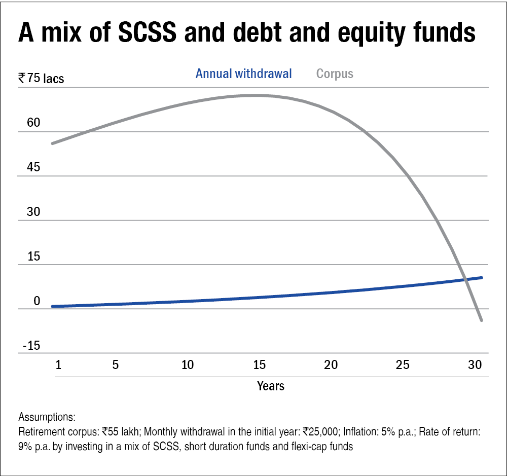 Many retirees prefer investing the whole corpus in a bank FD and opt for monthly interest payouts. This option appears convenient but it fails to provide inflation-adjusted income, so you may end up consuming your corpus much faster. If Mr Prasad chooses the FD way, he will be able to generate inflation adjusted income only for the next 21 years. On the other hand, if he is able to generate an annualised return of 9 per cent by investing in a mix of SCSS, short-duration funds and flexi-cap funds, his corpus would last longer, for the next 29 years.