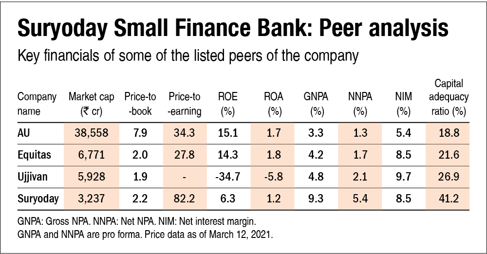 - COVID-led pandemic has severely disrupted economic activity. As per an order by the Supreme Court, banks have been restrained from declaring loans as non-performing that were not declared as NPA till August 2020. Before that, the banks were following the RBI's loans moratorium order. On a pro forma basis, Suryoday's GNPA, as of December 2020, would stand at 9.3 per cent. The complete extent of asset quality deterioration would only be known once the Supreme Court lifts moratorium.
