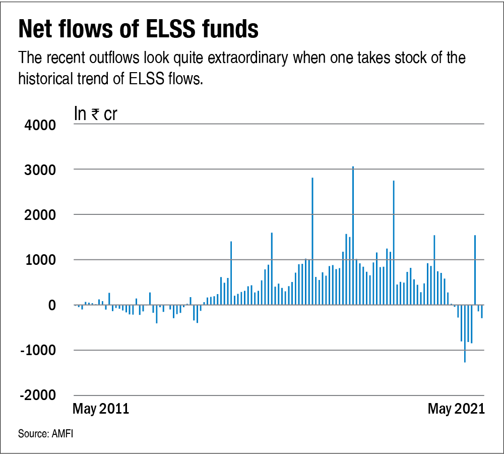 Tax-saving funds are an ideal investment for all types of investors. It's the combination of equity and tax-saving that makes ELSS funds the mainstream category. However, the category has largely been seeing net outflows since August 2020 barring March 2021. The historical trend suggests that the magnitude of outflows seen in the past few months does look like quite out of the ordinary (see the graph 'Net flows of ELSS funds'). In the graph, you can majorly see positive numbers but in the later leg, all you can see are negative numbers.