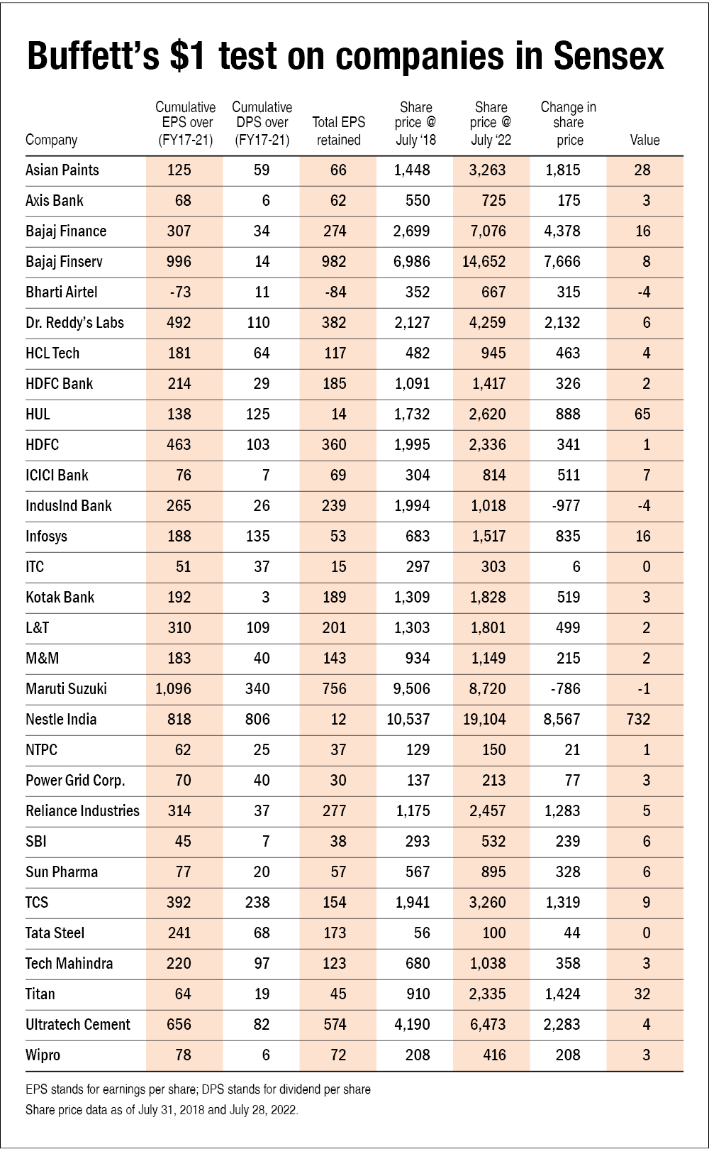 As can be seen, Balkrishna Industries retained a cumulative EPS of Rs 165 over FY17-21. This has translated into a share price change of Rs 1,068 over July 2018-2022. Thus, the value comes out to 6 (i.e., 1,068 divided by 165). This means for every Re 1 retained by Balkrishna, the company delivered Rs 6 of market value.