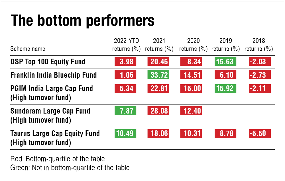 A total of five funds were in the bottom quartile for all but one year. Of these, three were funds with a high turnover ratio.