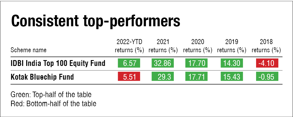 No large-cap fund made it in the top-half of the best performers table for all five years.