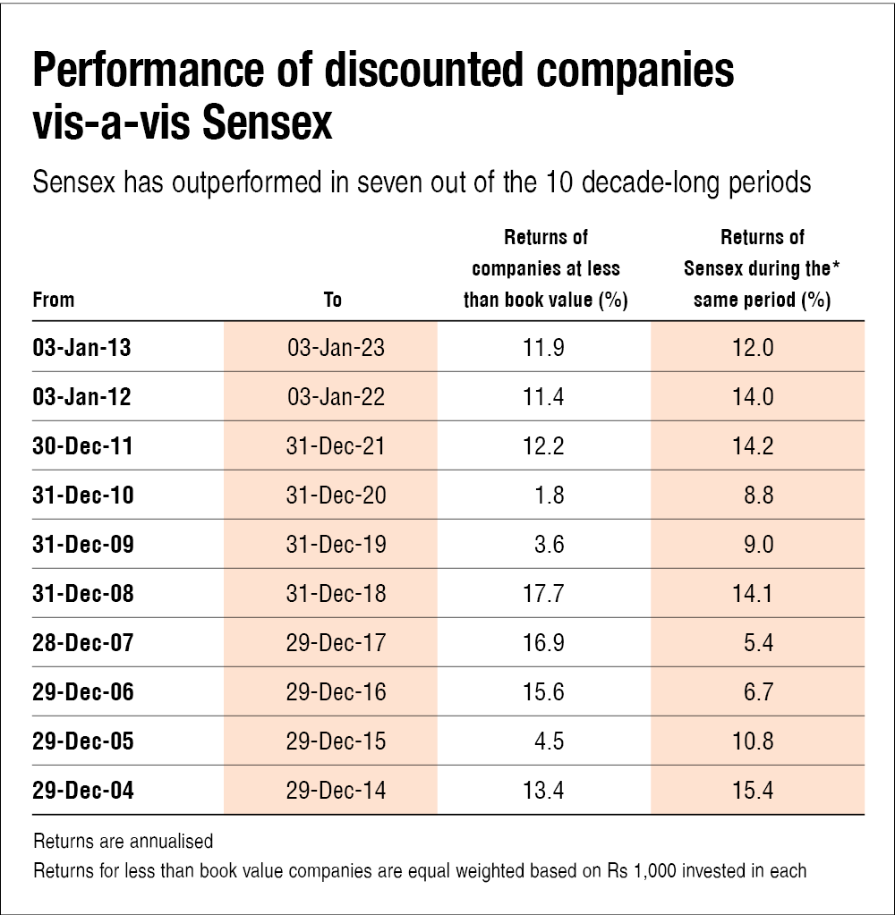 As you can see, Sensex outperformed these companies in most cases. In short, if you had a portfolio comprising only stocks that were trading at a low price-to-book value during the above periods, you probably wouldn't have beaten the overall market.