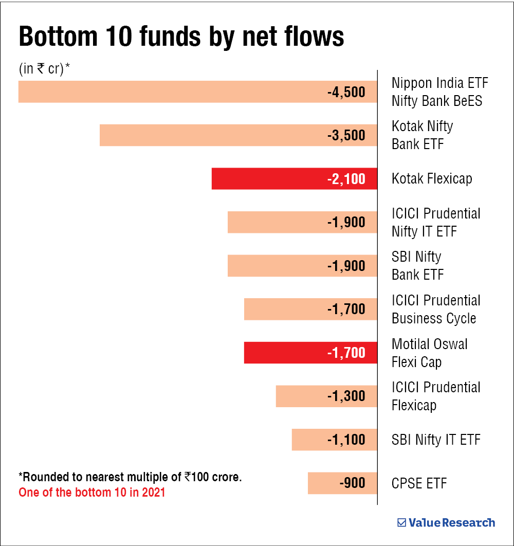 Investors gave a double thumbs down to thematic funds. There are seven such funds in the ignominy list. Despite listing positive returns by most of them (the bank ETFs even delivered more than 21 per cent returns) - except for SBI Nifty IT ETF and ICICI Pru Nifty IT ETF - these schemes received little traction last year.