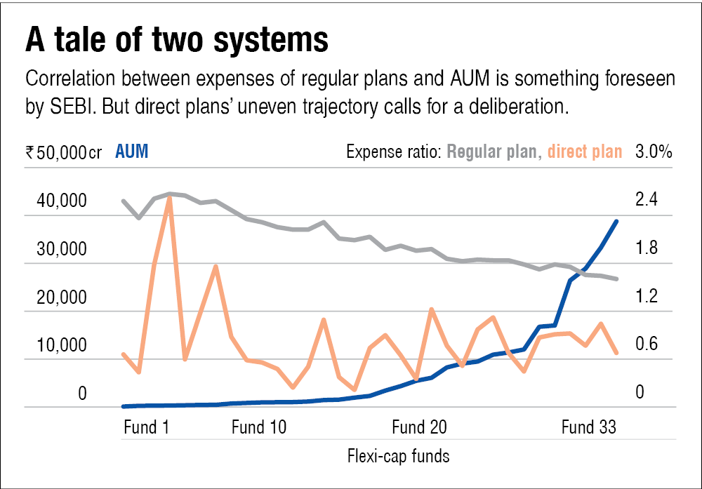 See the graph A tale of two systems, which maps the AUM and expense ratios of all flexi-cap funds (Fund 1 being the smallest flexi-cap fund by AUM and Fund 33 being the largest). In the case of regular plans, you can see the expense ratio progressively reducing with an increase in fund size. This is exactly what SEBI intended to achieve with its tiered expense-ratio formula for regular funds.